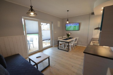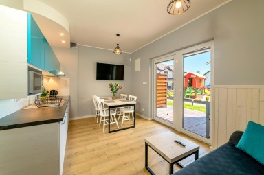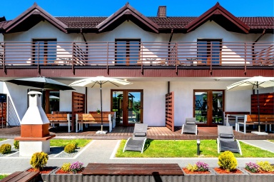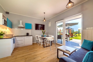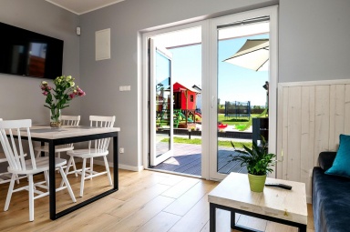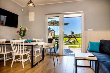 - Taras: Przed każdym domkiem znajduje się zadaszony taras z kompletem mebli ogrodowych ? idealny na poranne śniadania czy wieczorny relaks.