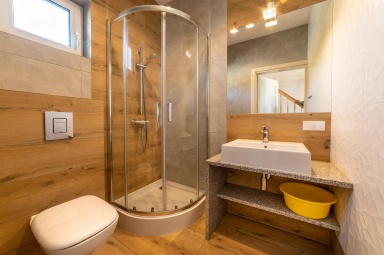 - Parter: Przestronny salon z sofą dwuosobową, w pełni wyposażony aneks kuchenny oraz łazienka z kabiną prysznicową.